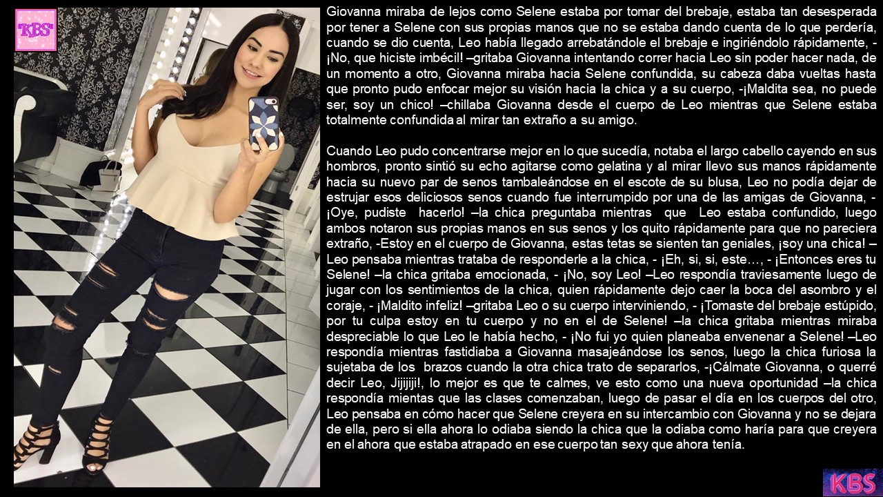 Cuando Leo pudo concentrarse mejor en lo que sucedía, notaba el largo cabello cayendo en sus hombros, pronto sintió su echo agitarse como gelatina y al mirar llevo sus manos rápidamente hacia su nuevo par de senos tambaleándose en el escote de su blusa, Leo no podía dejar de estrujar esos deliciosos senos cuando fue interrumpido por una de las amigas de Giovanna, -¡Oye, pudiste hacerlo! –la chica preguntaba mientras que Leo estaba confundido, luego ambos notaron sus propias manos en sus senos y los quito rápidamente para que no pareciera extraño, -Estoy en el cuerpo de Giovanna, estas tetas se sienten tan geniales, ¡soy una chica! –Leo pensaba mientras trataba de responderle a la chica, - ¡Eh, si, si, este…, - ¡Entonces eres tu Selene! –la chica gritaba emocionada, - ¡No, soy Leo! –Leo respondía traviesamente luego de jugar con los sentimientos de la chica, quien rápidamente dejo caer la boca del asombro y el coraje, - ¡Maldito infeliz! –gritaba Leo o su cuerpo interviniendo, - ¡Tomaste del brebaje estúpido, por tu culpa estoy en tu cuerpo y no en el de Selene! –la chica gritaba mientras miraba despreciable lo que Leo le había hecho, - ¡No fui yo quien planeaba envenenar a Selene! –Leo respondía mientras fastidiaba a Giovanna masajeándose los senos, luego la chica furiosa la sujetaba de los brazos cuando la otra chica trato de separarlos, -¡Cálmate Giovanna, o querré decir Leo, Jijijiji!, lo mejor es que te calmes, ve esto como una nueva oportunidad –la chica respondía mientas que las clases comenzaban, luego de pasar el día en los cuerpos del otro, Leo pensaba en cómo hacer que Selene creyera en su intercambio con Giovanna y no se dejara de ella, pero si ella ahora lo odiaba siendo la chica que la odiaba como haría para que creyera en el ahora que estaba atrapado en ese cuerpo tan sexy que ahora tenía.